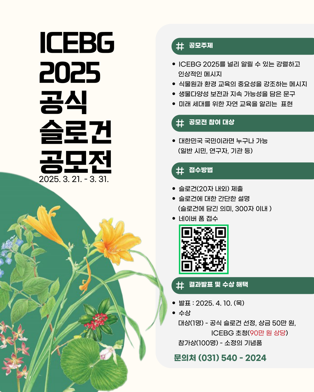 본 총회는 오늘로 개막을 80일 앞두고 있다. 이에 국립수목원은 ▲기후변화 대응과 생물다양성 보전, ▲미래 수목원·식물원 교육의 가치 등 ICEBG 2025 개최의 취지와 목표를 담은 창의적인 슬로건을 선정하여 대중과 소통의 창을 열고, 총회를 효과적으로 홍보하기 위해 공모전을 마련하였다.